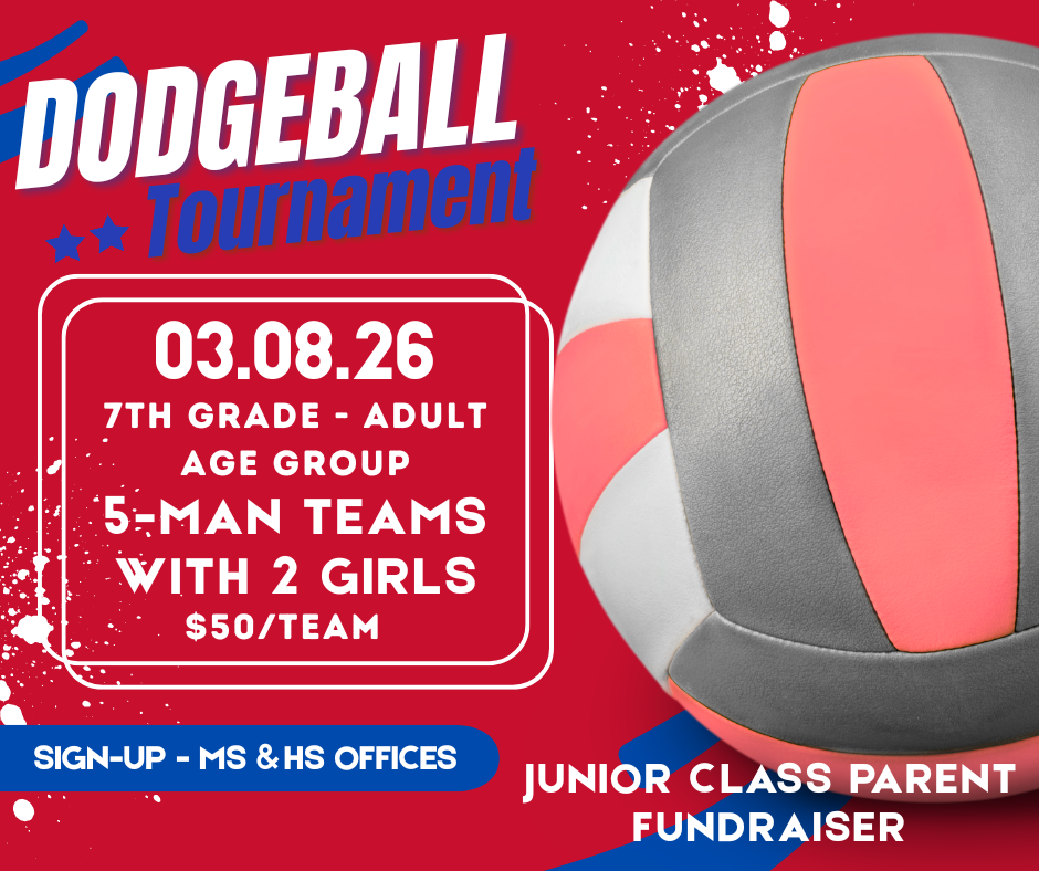 JUNIOR CLASS PARENTS WILL BE HOSTING A DODGEBALL TOURNAMENT ON SUNDAY, MARCH 8TH, IN THE HS GYM TO HELP RAISE FUNDS FOR AFTER-PROM.SIGN-UP IN THE MIDDLE SCHOOL OR HIGH SCHOOL OFFICES. THIS WILL BE ...